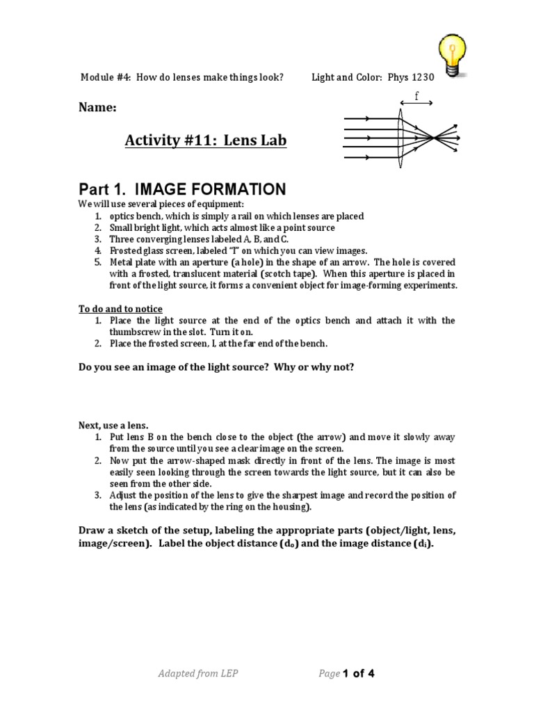 Activity 11 Lens Lab Part 1. Image Formation PDF Lens (Optics